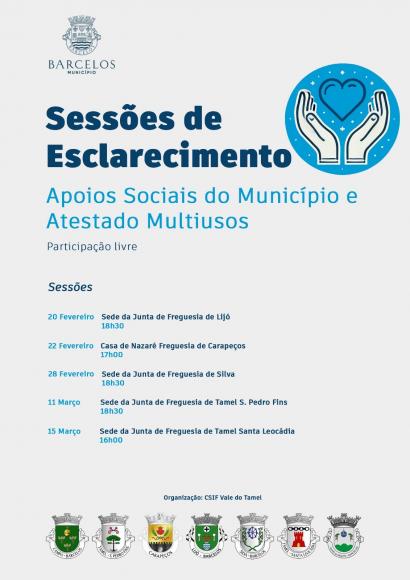 No dia 11 de março irá realizar-se na Delegação da Junta de Freguesia em Tamel S. Pedro Fins, pelas 18h 30m, uma sessão de esclarecimentos sobre os Apoios Sociais do Município e os Atestados multiusos.