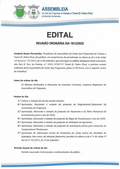 11-DEZ-2025 Anabela Rosas Fernandes, Presidente da Assembleia da União das Freguesias supra: Faz público, em cumprimento do disposto na alinea b) do n." 1 do art." 14" da [ei n." 75120131, de 12 de setembro, que a próxima Sessão Ordinária desta Assembleia União das Freguesias vai realizar-se no edifício-delegação desta autarquia, sito na Rua Nossa Senhora da Portela, n.º 1010, 4750-711, Tamel (S. Pedro Fins), no próximo dia 19 de dezembro de 2025, pelas 2I:OO horas.